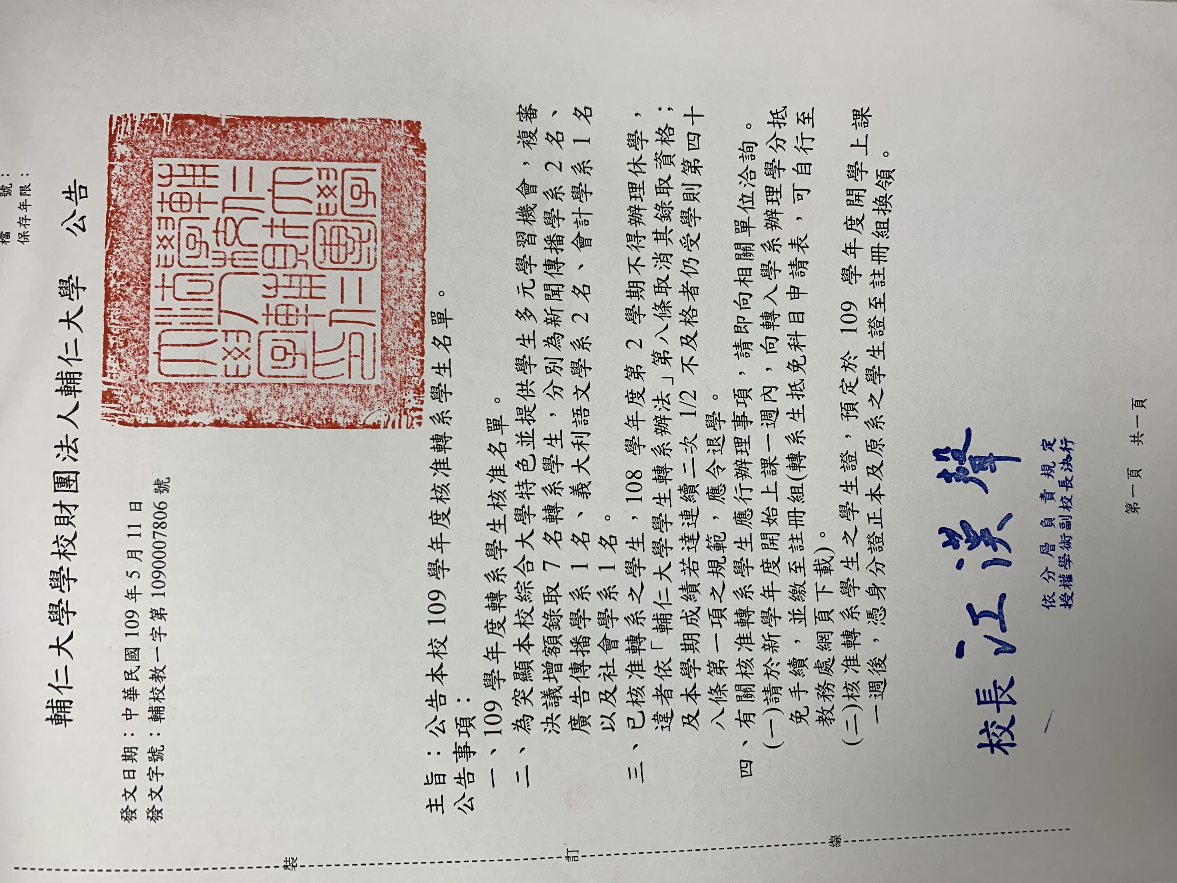 109學年度轉系生公告名單 2020-05-12• 學涯規劃 109學年度轉系生公告名單 附件下載 轉系公告公文.jpg 109日間部轉系錄取名單--公告版.pdf 109進修部轉系錄取名單--公告板(1).pdf